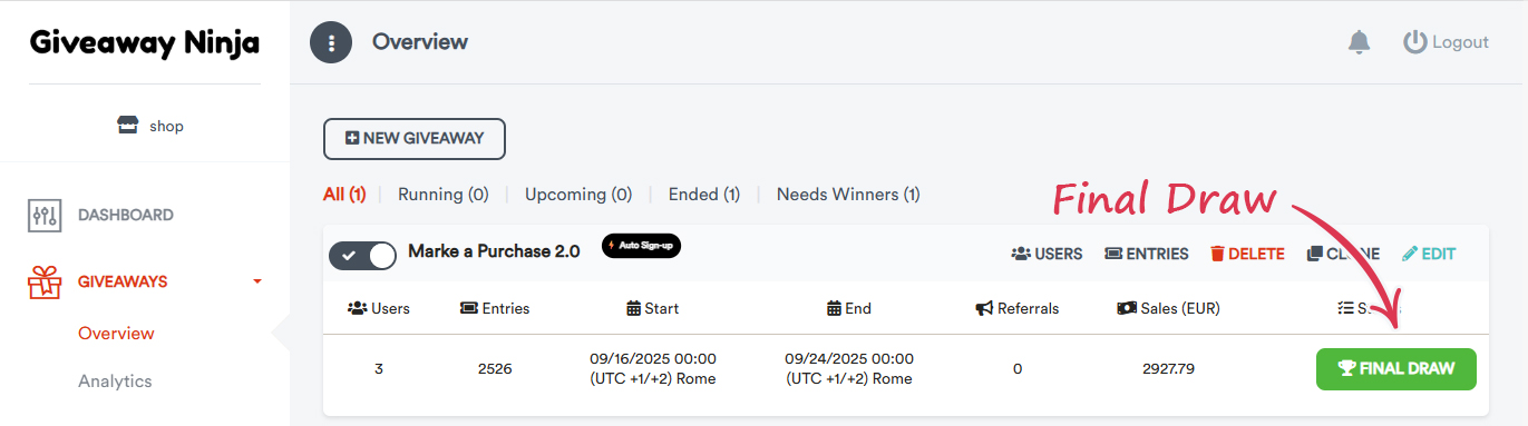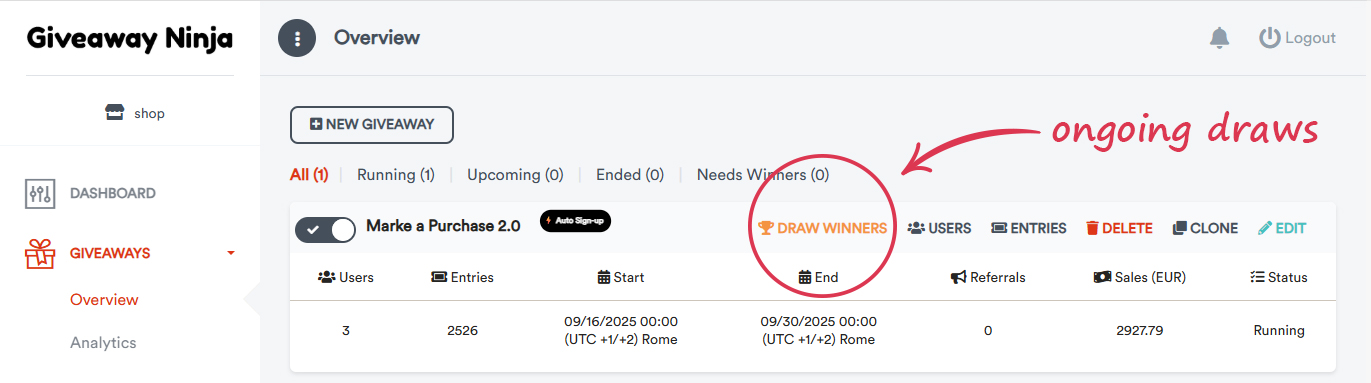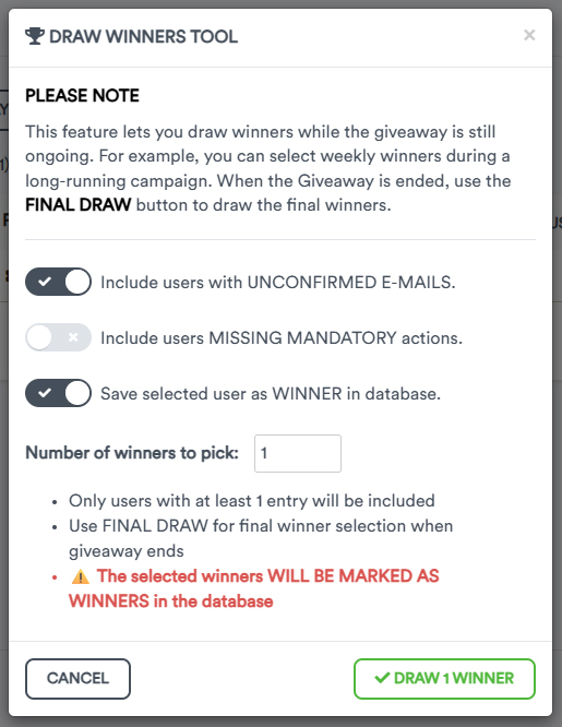 is working as expected, click DRAW WINNERS to perform the actual draw.