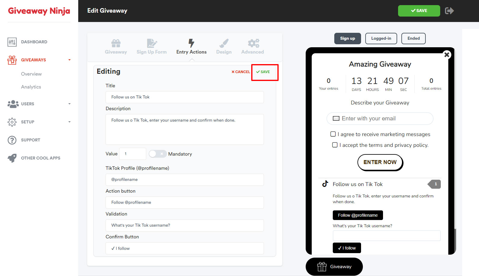 Click on the green "SAVE" button at the top of the page to save the Giveaway.